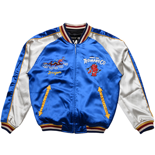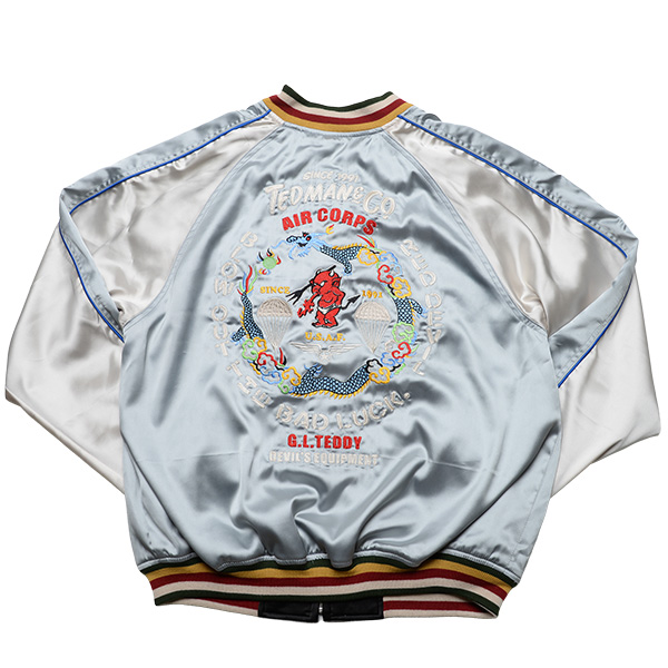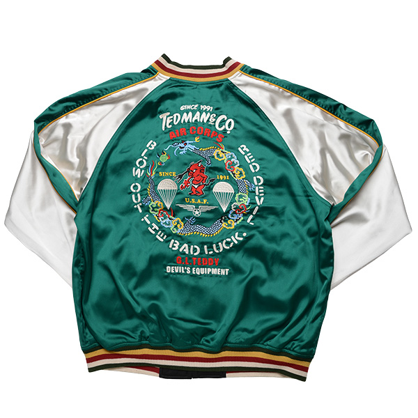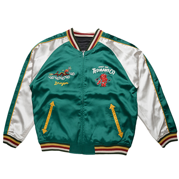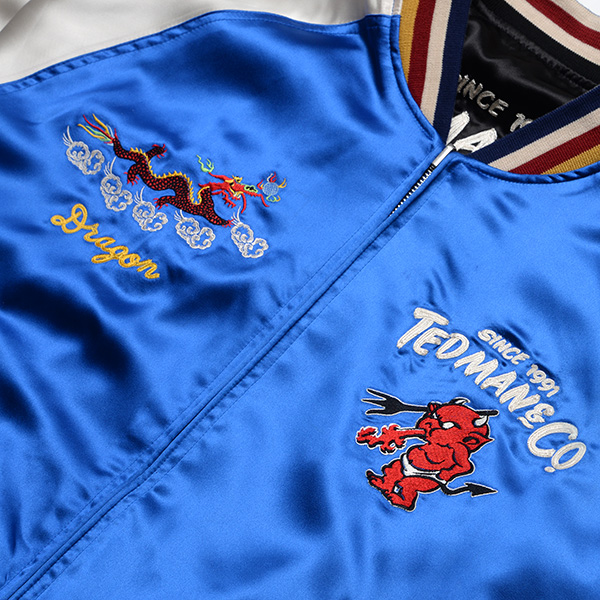 龍がテッドマンを囲んだ派手なデザイン。対照的に裏面の刺繍はチェーンステッチ仕様。表裏共にレーヨン風ヘビーポリサテンを使用した大人な一着です。